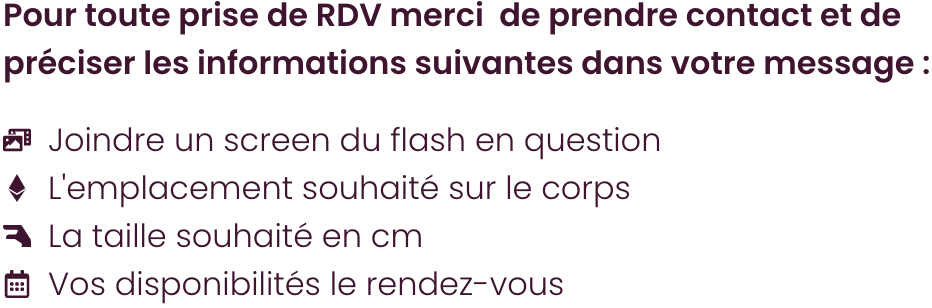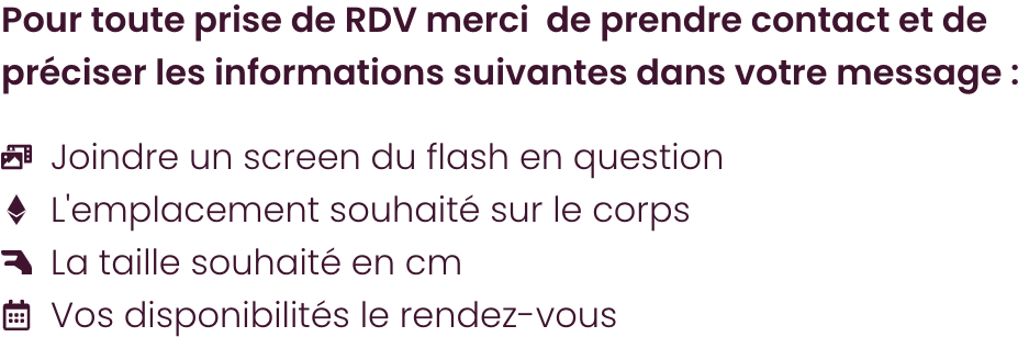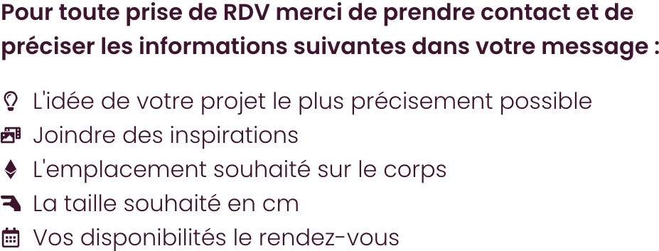Pour toute prise de RDV merci de prendre contact et de préciser les informations suivantes dans votre message :